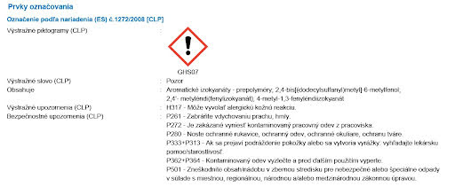 Aj za normálnych podmienok používania môže výrobok produkovať nebezpečné výpary, ktoré môžu spôsobiť podráždenie dýchacích ciest. Zabezpečte primerané vetranie. Pred použitím si prečítajte kartu bezpečnostných údajov výrobku.